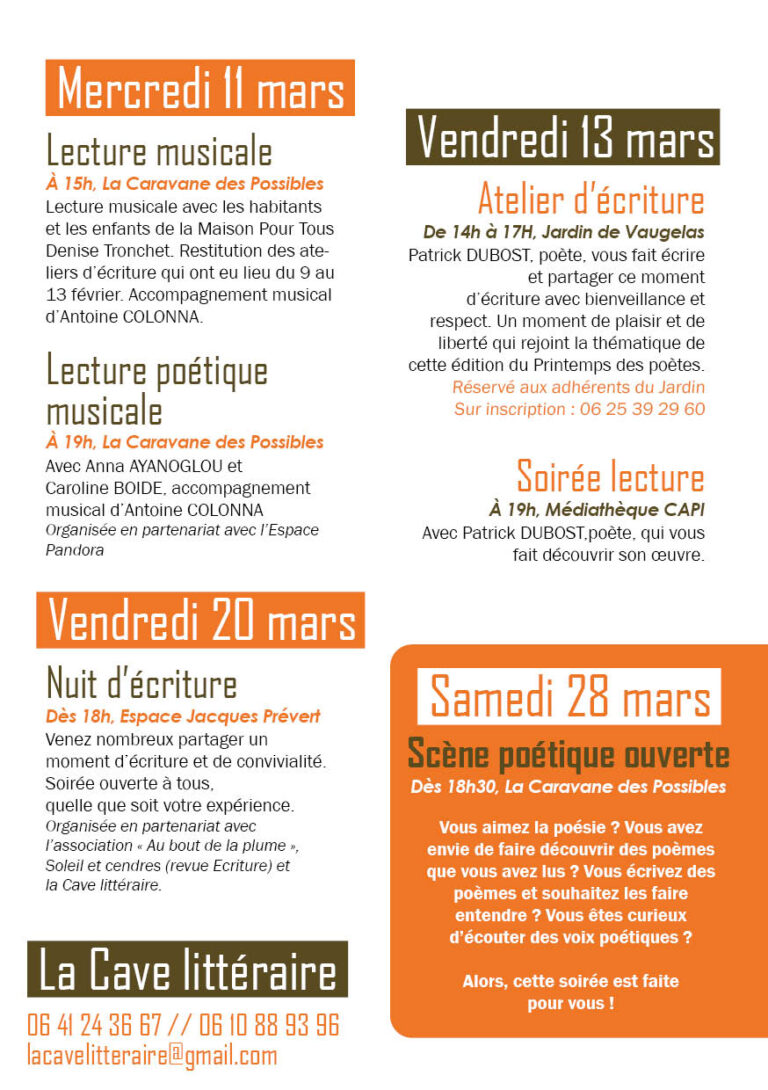 Organisée en partenariat avec l’association « Au bout de la plume », Soleil et cendres (revue Ecriture) et la Cave littéraire.